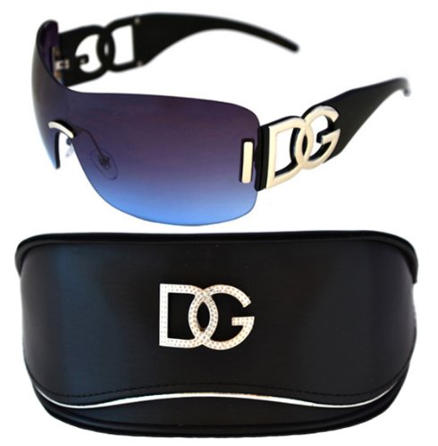 These are very high quality, stylish sunglasses. The frames are oversized and rimless with a large silver DG logo on each side. They are 5.5 inches wide with polycarbonate lenses that are 2.25 inches in height. The DG Eyewear sunglasses case fits all models of DG Eyewear (except for the few models that will not fit into any case because their arms are not designed to fold). It is black on the outside with silver trim and a silver 3D DG logo. The inside is solid black.